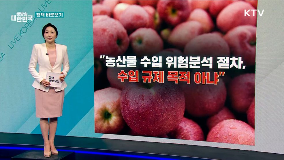 김유영 앵커>언론 속 정책에 대한 오해부터 생활 속 궁금한 정책까지 짚어보는 정책 바로보기입니다.미국산 사과 수입에 대한 과잉 처벌·보호가 비관세장벽이 되고 있다는 언론 보도가 나왔습니다.사실 확인해보고요.산불 피해를 입은 가계와 중소기업을 위한 금융지원 서비스를 살펴봅니다.1. "농산물 수입 위험분석 절차, 수입 규제 목적 아냐"정부는 외래 병해충으로부터...
