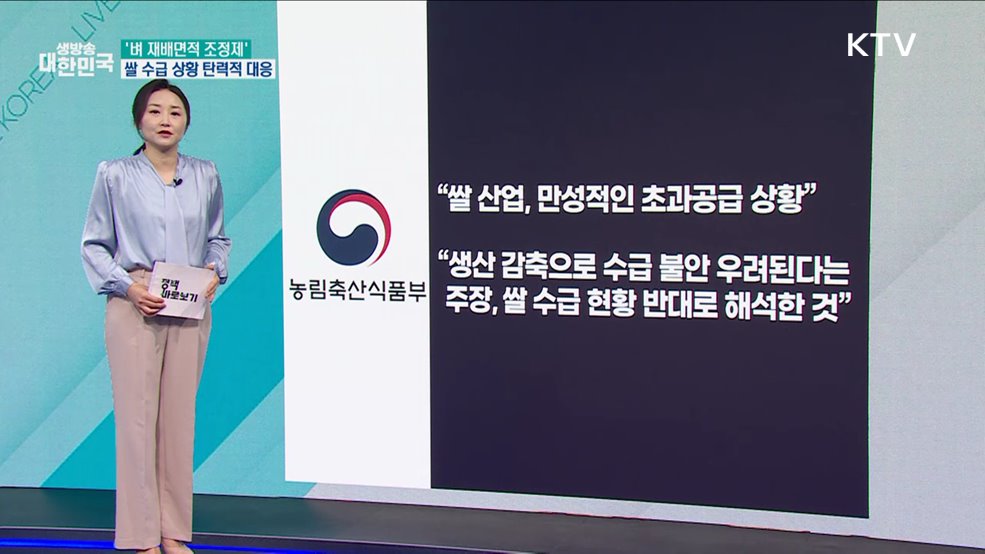 김유영 앵커>언론 속 정책에 대한 오해부터 생활 속 궁금한 정책까지 짚어보는 정책 바로보기입니다.정부의 벼 재배면적 감축이 수급 불안을 키운다는 언론 지적이 나왔습니다.사실 확인해보고요, 운전면허 관리를 강화하는 내용의 제도 개선 방안이 마련됐는데, 그 내용 살펴봅니다.1. "벼 재배면적 줄더라도 여전히 공급 과잉"정부는 작황 부진 등으로 인한 일시적인 수...