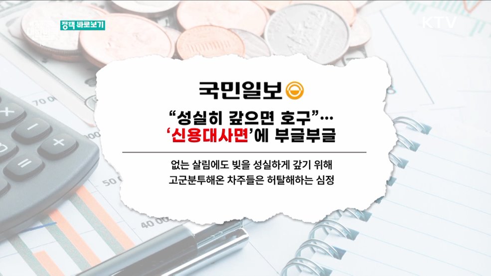 심수현 정책캐스터>채무자가 과거 실패로 안한 신용평가 불이익과 금융거래 제한에서 벗어나 경제활동으로 복귀할 수 있도록 정부에서 신용회복을 지원하기로 했습니다.하지만 해당 정책을 두고 일각에선 도덕적 해이를 조장한다는 지적이 제기되고 있는데요.관련 내용 포함해 오늘 총 3가지 내용 짚어봅니다.1. 신용회복지원, "성실히 갚은 사람만 손해?"일부 언론에서는 이...