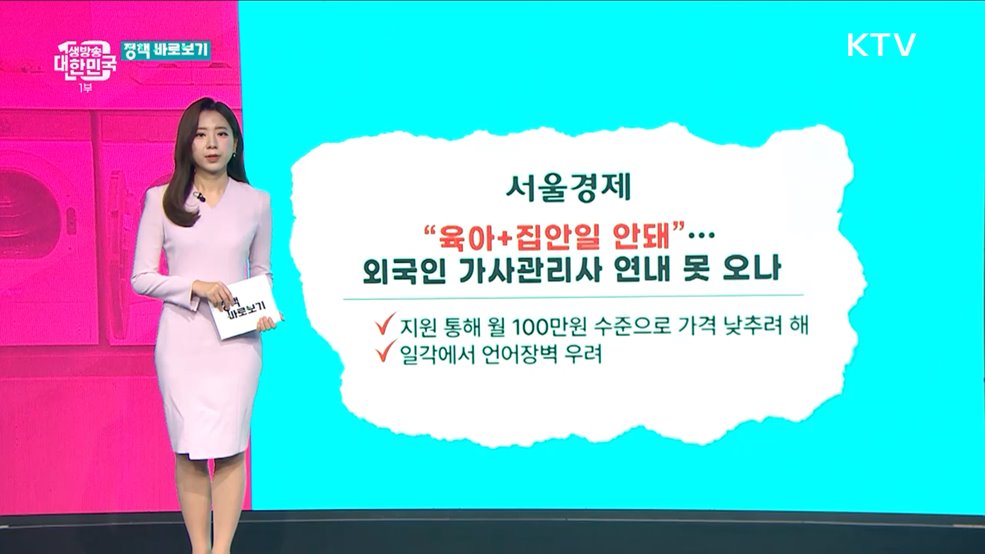 심수현 정책캐스터>서울시에서 도입할 '외국인 가사도우미' 시범사업에 관심이 쏠리고 있습니다.돌봄 부담을 줄일 수 있을 거란 기대감과 함께 부작용에 대한 우려도 나오고 있는데요.관련한 언론보도 포함해 오늘 총 3가지 내용 짚어봅니다.1. 외국인 가사관리사 시범사업 추진···"연내 시행 목표" 최근 한 언론에서 나온 기사입니다.외국인 가사관리사가 올해 안에 들...