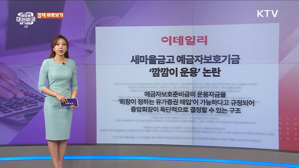 심수현 정책캐스터>언론 속 정책에 대한 오해부터 생활 속 궁금한 정책까지 자세히 짚어드립니다.정책바로보기, 심수현입니다.1. 새마을금고 예금자보호기금, '깜깜이 운용'했다?새마을금고의 자금이탈이 최근 한풀 꺾이면서 사태가 진정세에 접어들었다는 평가가 나오고 있습니다.이번 사태를 진정시키기 위해 정부와 새마을금고 측에서는 파산이 일어나도 예금 5천만 원 까지...