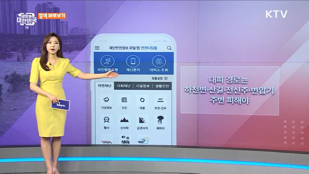 심수현 정책캐스터>언론 속 정책에 대한 오해부터 생활 속 궁금한 정책까지 자세히 짚어드립니다.정책 바로보기, 심수현입니다.1. “안전디딤돌앱 통해 대피경로 미리 설정”···집중호우 시 행동요령 집중호우로 수많은 인명 피해가 발생했지만, 계속해서 많은 비가 예고돼 있는 상황인데요.요즘 같은 상황엔 재난정보를 수신할 수 있도록 행정안전부에서 운영하는 안전디딤돌...
