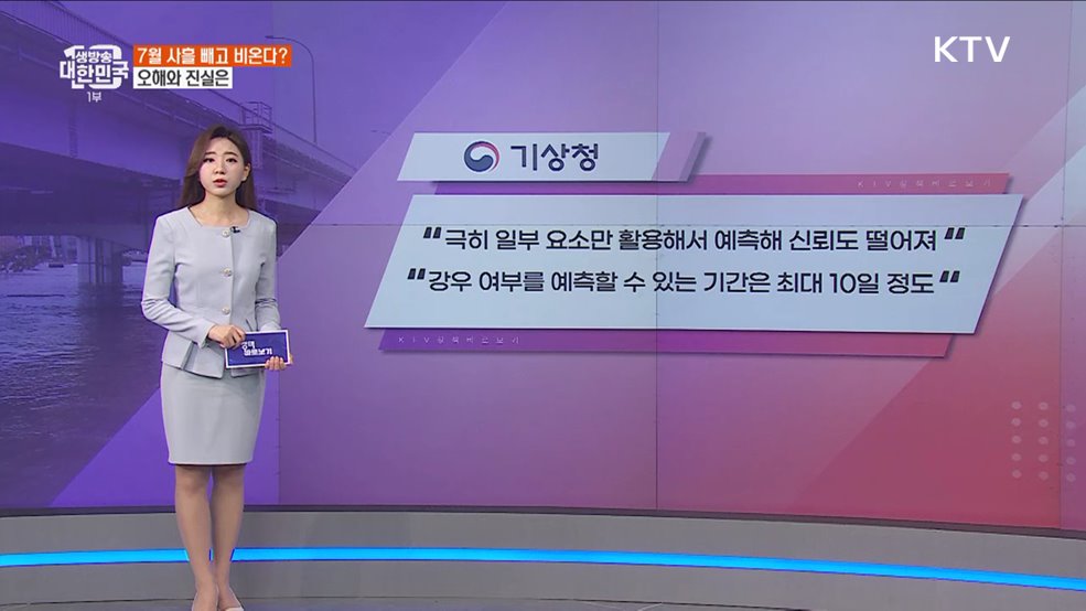 심수현 정책캐스터>언론 속 정책에 대한 오해부터 생활 속 궁금한 정책까지 자세히 짚어드립니다.정책 바로보기, 심수현입니다.1. "7월에 사흘 빼고 비오나요?" 기상청 답변은최근 SNS를 중심으로 올해 7월에는 사흘을 제외하고 계속 비가 온다는 내용의 날씨 예보가 확산하고 있습니다.이로 인해 휴가 관련 예약을 망설이는 분들의 고민글도 쉽게 찾아볼 수 있었습니...