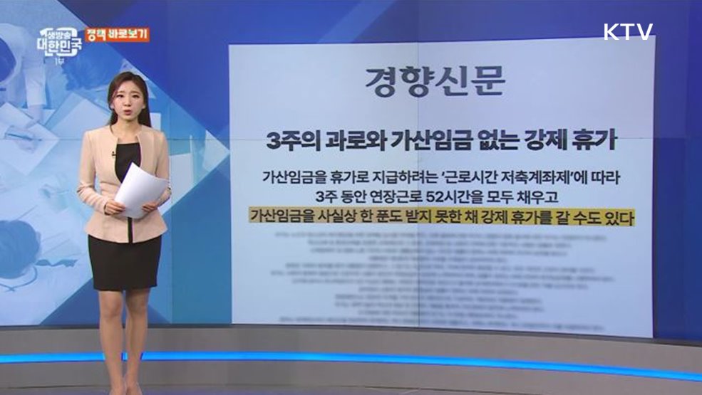 심수현 정책캐스터>언론 속 정책에 대한 오해부터 생활 속 궁금한 정책까지 자세히 짚어드립니다.정책 바로보기, 심수현입니다.1. 근로시간저축계좌제 도입되면 '강제 휴가' 써야 한다?근로시간저축계좌제는 업무량이 많을 때 초과근무를 하면 이를 저축해뒀다가 일이 적을 때 휴가로 소진하는 제도인데요.정부에서 내놓은 근로시간 제도 개편안의 핵심 중 하나로 꼽히죠.그런...