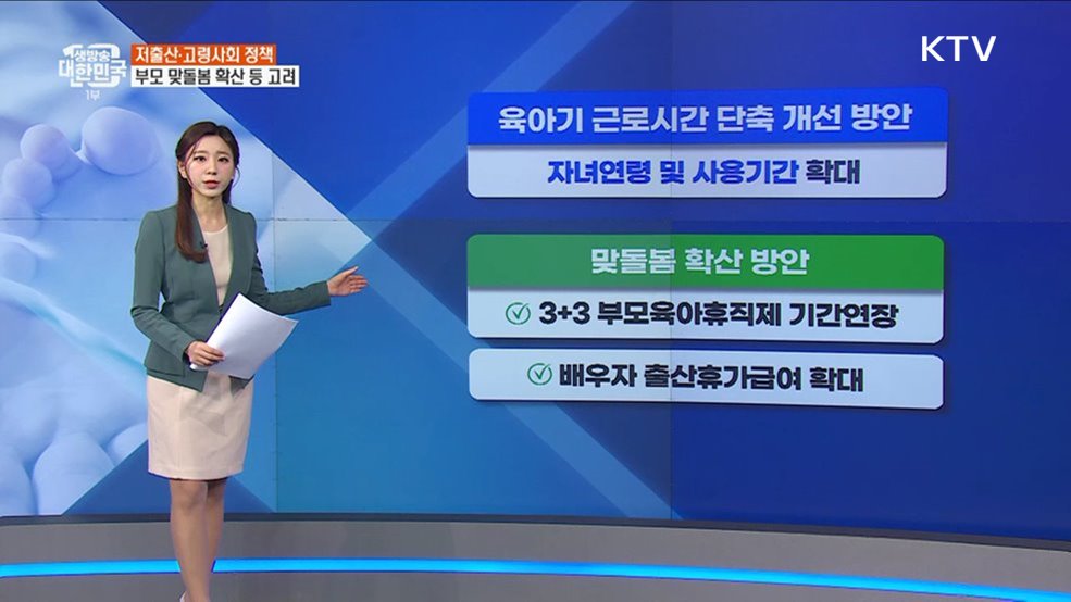 심수현 정책캐스터>언론 속 정책에 대한 오해부터 생활 속 궁금한 정책까지 자세히 짚어드립니다.정책 바로보기, 심수현입니다.1. ‘일하며 아이 돌볼 수 있는 사회’ 만들기 위한 정책은?저출산고령사회위원회는 최근 1차 회의를 열고 저출산과 고령화 대책을 내놓았는데요.일하는 부모의 육아지원 강화를 위해 육아기 근로시간 단축 확대와 재택근무 확산 등의 내용을 담았...