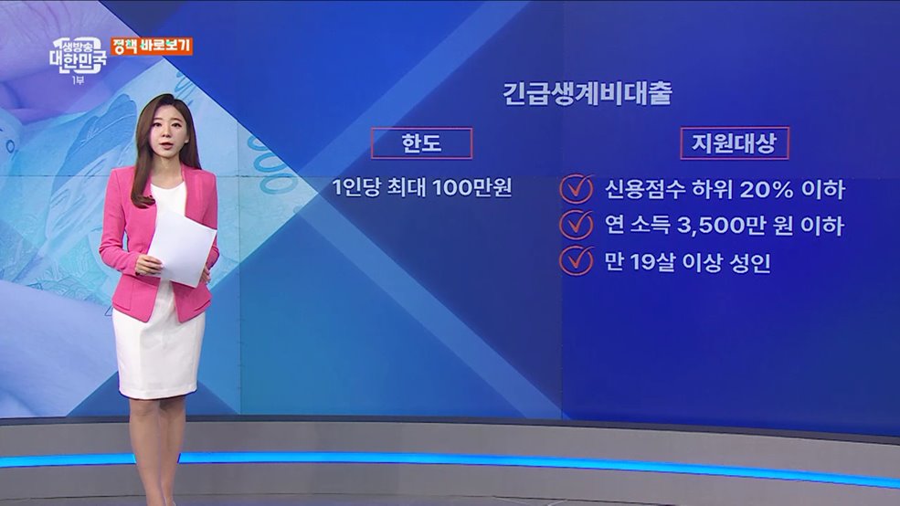 심수현 정책캐스터>언론 속 정책에 대한 오해부터 생활 속 궁금한 정책까지 자세히 짚어드립니다.정책바로보기, 심수현입니다.1. 취약계층에겐 너무 높은 '긴급생계비 대출' 금리? 오해와 진실은오는 27일 출시되는 긴급생계비 대출에 대한 관심이 뜨겁습니다.신용평점 하위 20% 이하이면서 연소득 3,500만 원 이하인 성인이라면 최대 100만원까지 대출이 가능한데...