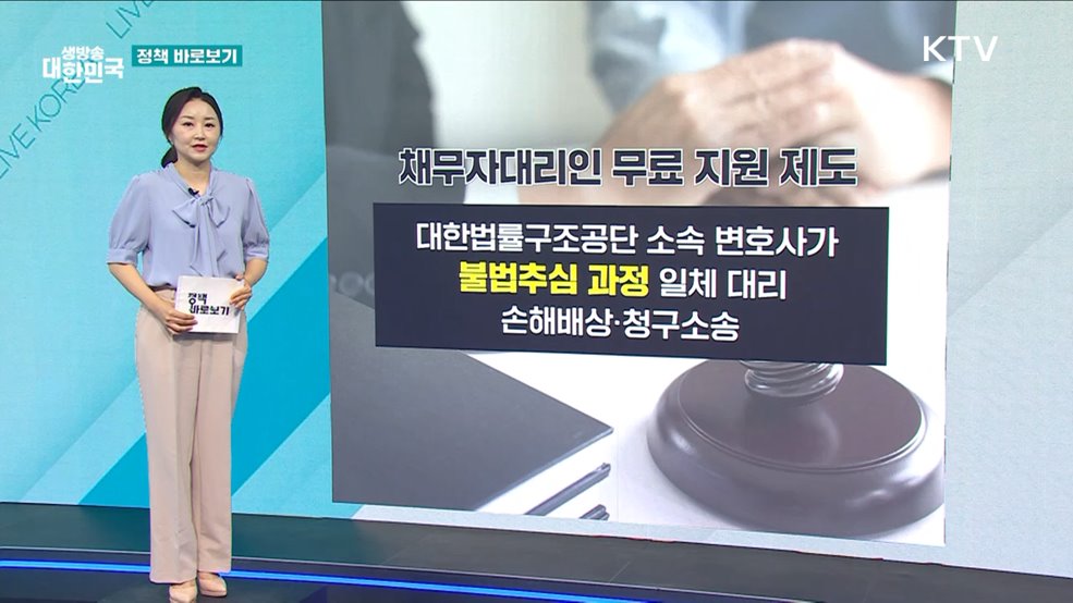 김유영 앵커>언론 속 정책에 대한 오해부터 생활 속 궁금한 정책까지 짚어보는 정책 바로보기입니다.채무자대리인 제도를 피해자들이 더 빨리 이용할 수 있도록 개선방안이 시급하다는 지적이 나왔습니다.사실 확인해보고요.폭염을 대비해 중소사업장을 위한 건강보호대책, 살펴봅니다.1. 금융위 "채무자대리인 지원 및 불법 민간솔루션업체 차단 강화"최근 언론 보도에서 '불...