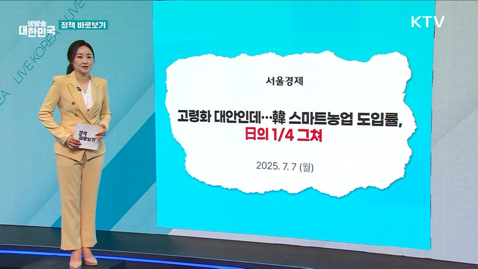 김유영 앵커>언론 속 정책에 대한 오해부터 생활 속 궁금한 정책까지 짚어보는 정책 바로보기입니다.우리나라의 스마트농업 도입률이 이웃나라 일본과 비교해 낮다는 지적이 나왔습니다.사실 확인해보고요.'민생회복 소비쿠폰'을 어디에서 써야 할지 사용처, 알아봅니다.1. '스마트농업 확산 정책' 차질 없이 추진 중···시설면적 16% 보급최근 언론 보도에서 '고령화 ...