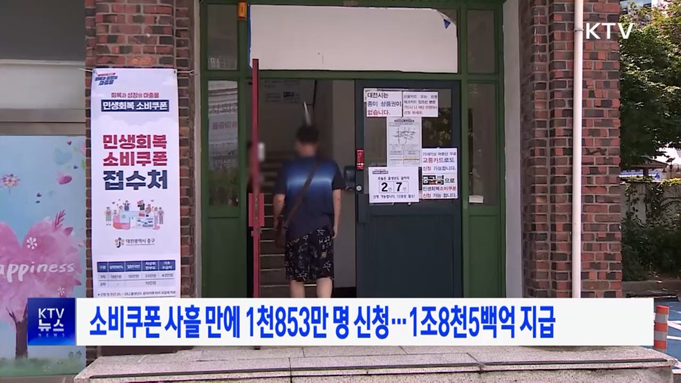 김유영 앵커>2차 민생회복 소비쿠폰 신청자 수가 신청 사흘 만에 1천8백만 명을 넘었습니다.행정안전부에 따르면 어제(24일)까지 소비쿠폰 신청자 수는 전체 대상자의 40.8%인 1천853만 명으로 집계됐습니다.지난 사흘간 신청으로 지급된 금액은 총 1조8천583억 원입니다.한편 행안부는 오늘(25일)부터 소비쿠폰 사용처에 재단법인 아름다운 가게도 포함하기로...