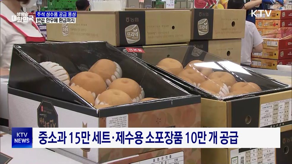 김용민 앵커>올 추석 성수품 공급이 원활한 가운데, 소비자를 위한 풍성한 할인과 혜택도 이어집니다.김현지 앵커>축산물은 최대 반값까지 저렴하게 살 수 있고, 다음 달부터는 전통시장 온누리상품권 환급도 시작됩니다.최유경 기자입니다.최유경 기자>23일 기준, 주요 성수품 소매가는 지난해 추석보다 2%가량 낮은 것으로 나타났습니다.당초 정부 계획보다 초과 공급되...