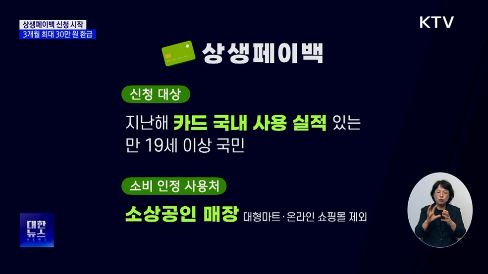 모지안 앵커지난해보다 카드 사용이 늘면 환급금을 받는 상생페이백 신청이 시작됐습니다.최대 30만 원을 돌려받을 수 있는데요.조태영 기자가 소개합니다.조태영 기자>상생페이백 신청이 15일 오전 9시부터 시작됐습니다.신청 기간은 오는 11월 30일 자정까지입니다.지난해 사용한 월평균 카드 사용액보다 올 9월, 10월, 11월 소비가 늘면 증가분의 20%를 돌려...