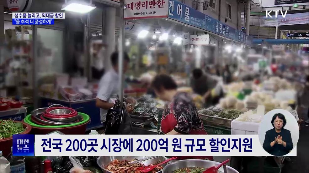 김경호 앵커>정부는 추석을 앞두고 전통시장과 유통업체 등에서 대규모 할인 행사를 지원합니다.특히 민생회복 소비쿠폰이 사용 가능한 전통시장에서 할인 지원을 크게 늘리기로 했습니다.계속해서 최유경 기자입니다.최유경 기자>(장소: 15일, 대전 중앙시장)추석을 3주 앞둔 전통시장, 미리 장을 보러온 사람들로 붐빕니다.인터뷰> 김영숙 / 대전 오정동 주민"총각무 ...