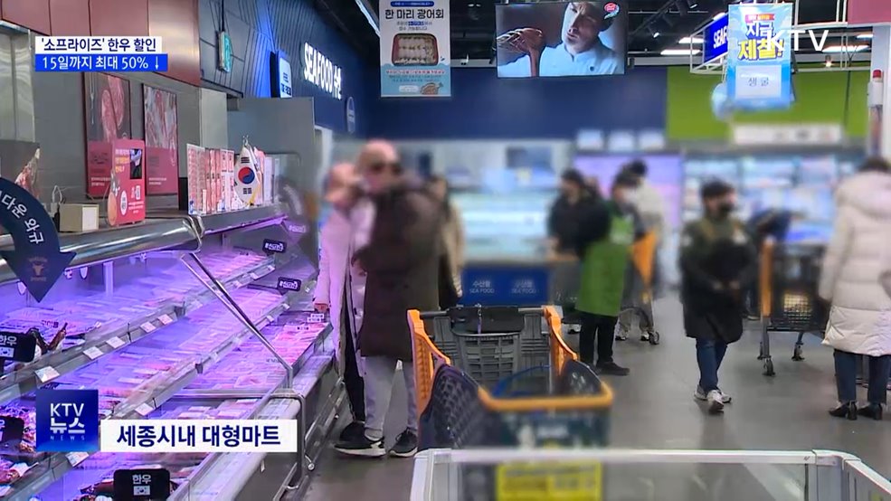 김유영 앵커>한우 소비가 느는 설 명절이 다가오고 있습니다.설맞이 한우 할인 행사, '소프라이즈'가 진행되는데요.구이용 등심부터 국거리 양지 등 다양한 품목을 최대 50% 할인 판매합니다.최유경 기자입니다.최유경 기자>(장소: 세종시내 대형마트)마트에 진열된 한우 제품들.유심히 살펴보지만 선뜻 장바구니에 담지 못합니다.최근 크게 오른 축산 물가가 부담입니다...
