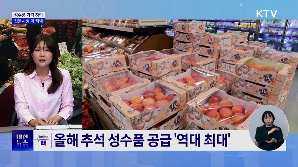 김경호 앵커>추석 연휴 기간 성수품 공급 상황도 알아보겠습니다.최유경 기자, 주요 성수품 물가가 비교적 안정세를 보이고 있는데요.현재 성수품 공급 상황은 어떻습니까?최유경 기자> 네, 정부는 올해 추석 성수품을 역대 최대 규모인 총 17만 2천 톤 공급하게 됩니다.이중 농축산물이 15만 8천 톤, 수산물이 1만 4천 톤이고요.특히 사과와 배, 단감 등 주요...