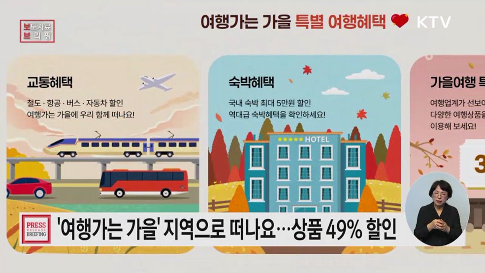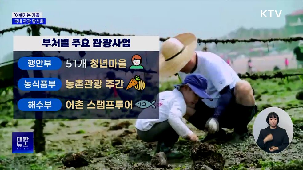 김경호 앵커>가을 맞이 국내 여행을 장려하는 범국민 여행 캠페인이 시작됐습니다.이 기간 할인된 가격으로 다양한 여행 프로그램을 즐길 수 있습니다.최유경 기자입니다.인터뷰> 김현서 오경민 / 화성, 수원시"(연휴에) 가족들이랑 근처 돌아다니면서 나들이도 하고 맛있는 것도 먹고 그러려고요." 인터뷰> 김동윤 이영란 / 천안시"(가고 싶은 곳은) 거제도? 예쁘잖...