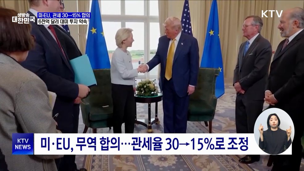 임보라 앵커>미국과 유럽연합이 무역협정을 타결했습니다.기존에 부과했던 30%의 관세율을 15%로 내리고, EU가 미국에 6천억 달러를 투자하기로 했습니다.신국진 기자입니다.신국진 기자>유럽연합과 미국이 현지시각 27일 영국 스코틀랜드에서 만나 관세 협상에 합의했습니다.미국은 기존에 예고했던 EU 상호관세를 30%에서 15%로 낮췄습니다.27.5%가 부과됐던...
