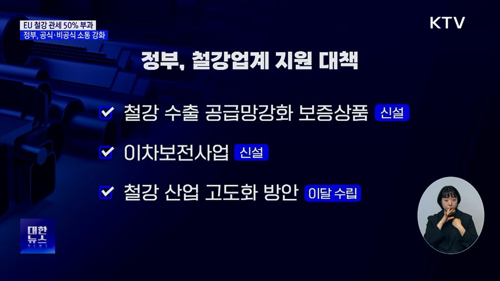 김경호 앵커>유럽연합이 수입산 철강에 50% 관세를 부과하기로 하면서 최대 수출국인 한국의 고심이 깊어졌습니다.정부는 모든 채널을 동원해 전력 대응에 나서는 한편 이달 중 철강 산업 경쟁력 강화 방안을 발표하기로 했습니다.신국진 기자입니다.신국진 기자>현지시간으로 지난 7일 EU 집행위원회는 기존 철강 세이프가드 조치를 대체할 새로운 저율관세할당(TRQ) ...