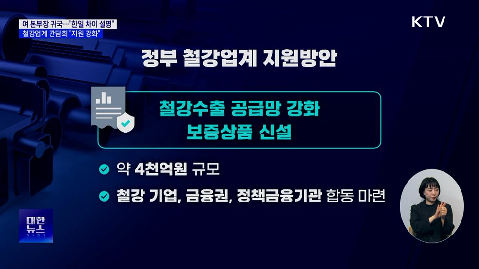 모지안 앵커>무역협상을 위해 미국을 방문했던 여한구 통상교섭본부장이 귀국했습니다.여 본부장은 한국과 일본은 다르다는 점을 미국에 최대한 설명했다고 전했습니다.김정관 산업부 장관은 벼랑 끝에 몰린 철강업계를 만나 애로사항을 듣고 경쟁력 강화 방안을 논의했습니다.신국진 기자입니다.신국진 기자>한미 무역 협상 후속 협의를 위해 미국을 방문했던 여한구 통상교섭본부...