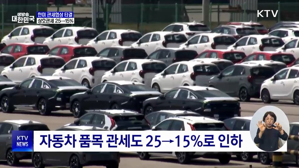 임보라 앵커>한국과 미국이 관세협상을 타결했습니다.상호관세를 25%에서 15%로 내리고, 자동차 품목 관세도 15%로 낮추기로 했습니다.문기혁 기자입니다.문기혁 기자>8월 1일 상호관세 부과를 앞두고, 한미 양국이 관세협상을 타결했습니다.미국은 한국에 대한 상호관세를 25%에서 15%로 낮추기로 했습니다.자동차와 관련 부품에 적용하는 품목 관세도 25%에서...