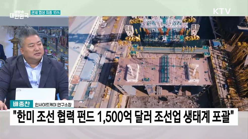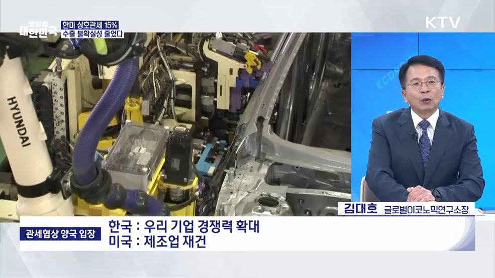 임보라 앵커>오늘 오전 한국과 미국 간 상호관세 협상이 타결됐습니다.녹록지 않은 여건이지만 국익 최우선 협상의 결과인데요.김대호 글로벌 이코노믹 연구소장과 함께 자세히 살펴보겠습니다.(출연: 김대호 / 글로벌 이코노믹 연구소장)Q. 한미 상호관세 15% 타결···의미는?Q. 대미 투자 3,500억 달러···평가는?Q. 조선 협력 성과와 전망은?Q. 자동차 ...