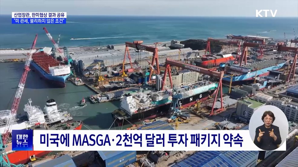 김현지 앵커>대통령실은 이번 한미 관세협상 타결로 인해 수출 불확실성이 상당 부분 제거됐다고 밝혔습니다.국익을 최우선으로 감내할 수 있는 수준에서 협상에 임한 결과, 주요국 대비 동등한 조건에서 경쟁할 수 있게 됐다고 평가했는데요.이혜진 기자의 보도입니다.이혜진 기자>대통령실은 이번 한미 관세 합의에서 가장 주목할 점은 미국과 조선업 분야 협력을 확대하기로...
