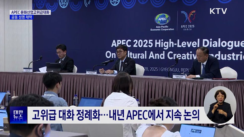 모지안 앵커>APEC 문화산업고위급대화가 경주에서 열렸습니다.APEC 회원국들이 문화 분야를 핵심 의제로 논의한 건 이번이 처음인데요.문화 창조 산업 분야 지속 협력을 담은 공동 성명이 채택됐습니다.보도에 김찬규 기자입니다.김찬규 기자>APEC 경제체 문화산업 분야 장관급 인사가 오는 10월 본회의가 열리는 경주에 모였습니다.문화 창조 산업 협력을 본격적으...