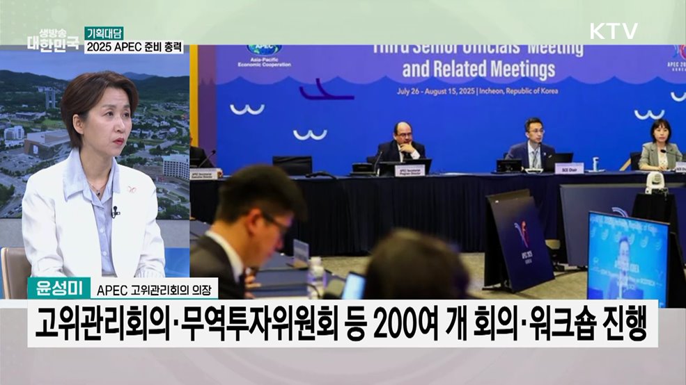 차현주 앵커>10월 경주에서 열리는 APEC 정상회의가 60여일 남은 가운데, 준비기획단을 비롯해 지자체와 민관 모두 현장 준비 체제에 돌입하며 막바지 총력전에 나섰습니다.APEC 준비 상황과 남은 과제에 대해 윤성미 APEC 고위관리회의 의장과 자세한 이야기 나눠보겠습니다.(출연: 윤성미 / APEC 고위관리회의 의장)차현주 앵커>먼저 10월 APEC 정...