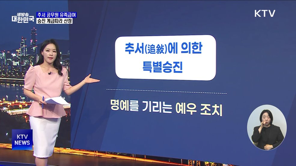 임보라 앵커>앞으로 순직 공무원이 특별 승진한 경우, 승진에 따라 인상된 유족 급여가 지급됩니다.이밖에 국무회의 의결 안건, 신경은 기자가 정리했습니다.신경은 기자 ske0610120@korea.kr1. 추서 공무원 유족급여 승진 계급따라 산정현재는 공무원이 공무 수행 중 사망, 전사한 경우, 뚜렷한 공적이 있을 때 특별 승진, '추서'가 이뤄집니다.공적을...
