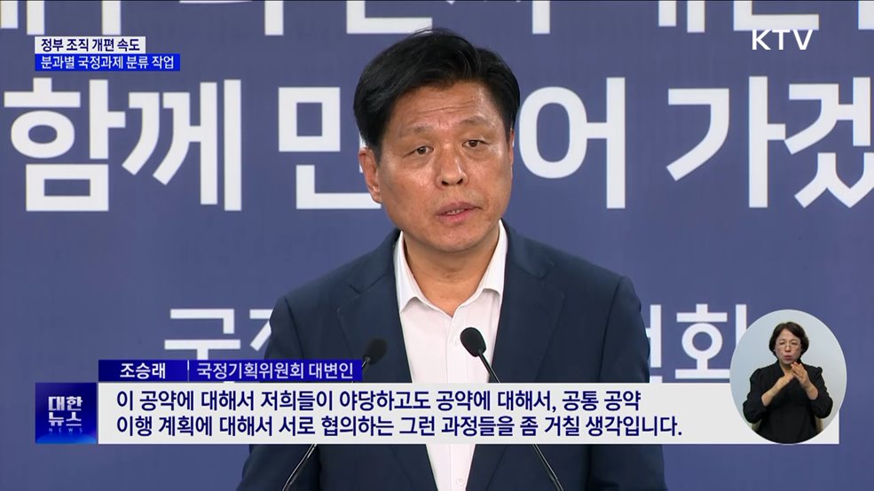 모지안 앵커>국정기획위원회가 정부 조직 개편에 속도를 냅니다.또 분과별 국정과제 분류를 위한 작업에도 돌입했습니다.윤현석 기자의 보도입니다.윤현석 기자>국정기획위원회는 정부 조직 개편 TF가 대통령 공약사항과 각 분과, 각 부처의 조직개편 수요 취합에 나섰다고 밝혔습니다.대통령 공약을 우선 검토할 계획인 만큼, 기후에너지부 신설과 기획재정부 기능 재편 등이...