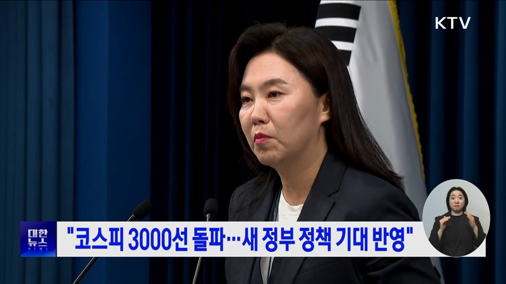 김경호 앵커>대통령실은 코스피 3000선 돌파와 관련해 새 정부 정책 기대감이 반영된 결과로 해석했습니다.강유정 대통령실 대변인은 새 정부 출범 후 코스피가 11.96% 올랐다며 같은 기간 G20 국가 증시가 소폭 하락한 점에 비춰볼 때 국제적 추세를 넘어선 상승이라고 밝혔습니다.이와 함께 국내외 투자자들이 정부 경제 정책에 거는 기대가 크다는 점에서 막중...