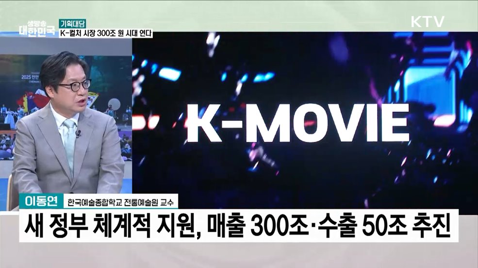 신경은 앵커>새 정부는 'K-컬처 시장 300조원 시대'를 열겠다는 비전을 제시하며, '문화강국' 도약을 선언했는데요.새 정부의 문화정책 방향과 과제를 한국예술종합학교 이동연 교수와 함께 자세히 짚어보겠습니다.(출연: 이동연 / 한국예술종합학교 교수)신경은 앵커>이재명 대통령은 '취임선서식'에서 문화산업에 대한 비전을 밝혔습니다.관련 내용, 들어보겠습니다....