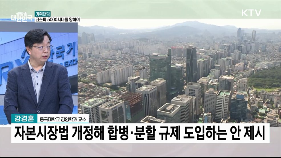 김용민 앵커>'코스피 5000시대'를 향한 발걸음이 본격화되고 있습니다.정부가 불공정 거래를 바로잡고, 자본시장 활력을 높이기 위해 총력을 다하고 있는데요.김현지 앵커>자세한 내용, 서울스튜디오에서 살펴보겠습니다.신경은 앵커!신경은 앵커>네, 대담 이어가겠습니다.새정부의 자본 시장 정책에 대해 동국대학교 경영학과 강경훈 교수와 함께 짚어보겠습니다.(출연: ...