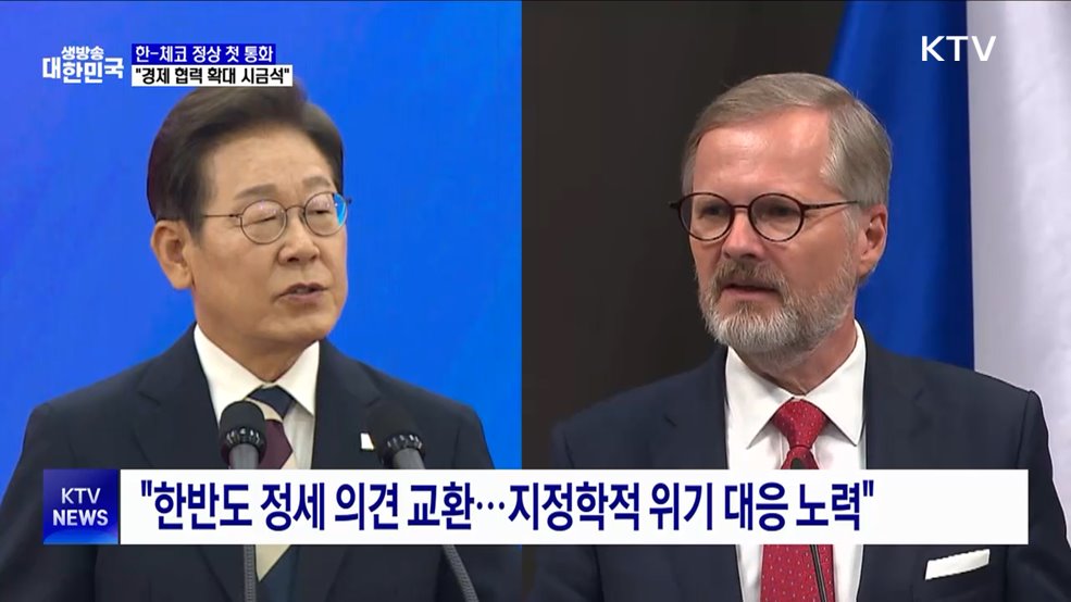 김용민 앵커>이재명 대통령이 페트르 피알라 체코 총리와 첫 전화통화를 했습니다.김현지 앵커>두 정상은 앞서 체코 원전 건설 계약이 최종 마무리된 것에 대해 대화를 나누고, 양국 경제 협력의 시금석이라고 평가했습니다.최영은 기자입니다.최영은 기자>이재명 대통령이 페트르 피알라 체코 총리와 첫 전화통화를 했습니다.두 정상은 먼저 최근 최종적으로 계약 절차가 마...