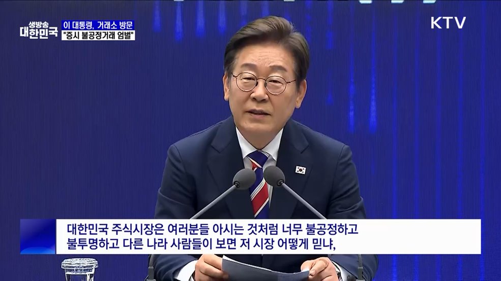 김용민 앵커>이재명 대통령이 한국거래소 시장감시위원회를 찾아 우리 주식시장 신뢰 확보의 중요성을 강조했습니다.김현지 앵커>정부는 주가 조작 등 불공정거래 행위는 엄벌하고, 부당이익엔 과징금을 물려 환수할 방침인데요.이 소식은 이혜진 기자가 전하겠습니다.이혜진 기자>한국거래소 불공정거래 근절을 위한 현장 간담회에 참석한 이재명 대통령.자본주의 시장경제의 핵심...