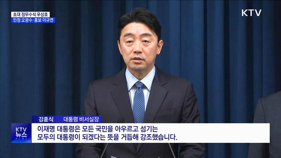 김경호 앵커>이재명 대통령이 대통령실 초대 정무수석비서관으로 우상호 전 더불어민주당 의원을 임명했습니다.민정수석비서관에는 오광수 변호사, 홍보수석비서관으로는 이규연 전 JTBC 대표가 발탁됐습니다.이혜진 기자의 보도입니다.이혜진 기자>대통령실 수석비서관 추가 인선이 발표됐습니다.이재명 대통령은 대통령실과 국회의 가교 역할을 할 정무수석에 우상호 전 더불어민...