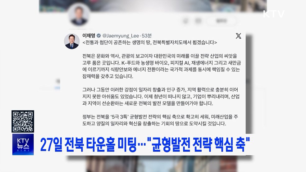 김유영 앵커>이재명 대통령이 오는 27일 전북에서 도민 200여 명과 함께 타운홀 미팅을 합니다.이 대통령은 타운홀 미팅 참석자를 모집하는 SNS 게시글을 통해 전북을 '5극 3특' 균형발전 전략의 핵심 축으로 확고히 세우겠다고 밝혔습니다.이 대통령은 이와 함께 전북을 양질의 일자리와 혁신을 창출하는 기회의 땅으로 도약시키겠다며 이번 타운홀 미팅에서 도민의...