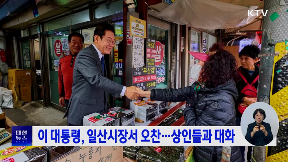 모지안 앵커>이재명 대통령이 일산의 한 전통시장을 찾아 상인들과 만났습니다.대통령실은 이 대통령이 방산 발전 토론회를 마친 뒤 일산시장을 방문해 점심식사를 하고 상인들에게 장사 근황을 묻는 등 대화를 나눴다고 밝혔습니다.또 시장 내 떡집에 들러 꿀떡 등을 구매하고 시민들과 사진 촬영을 함께 했다고 대통령실은 전했습니다.