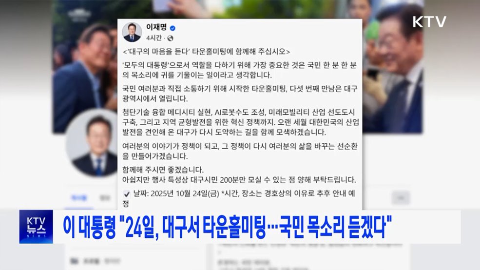 김유영 앵커>이재명 대통령이 오는 24일 대구광역시에서 다섯 번째 타운홀 미팅을 개최합니다.이 대통령은 SNS에 이 같은 소식을 전하며, 모두의 대통령으로서 가장 중요한 건 국민 한 분 한 분 목소리에 귀를 기울이는 거라고 강조했습니다.이어 첨단기술 융합 메디시티 실현, AI 로봇수도 조성, 지역 균형발전을 위한 혁신 정책 등 대구가 다시 도약하는 길을 함...