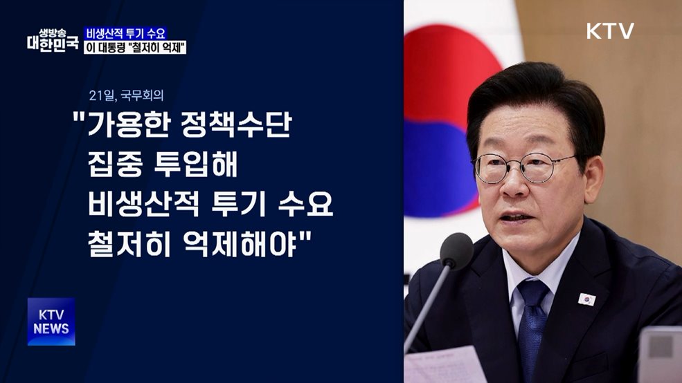 김용민 앵커>이재명 대통령이 비생산적 투기 수요를 철저히 억제해야 한다고 밝혔습니다.김현지 앵커>국민 경제를 왜곡하는 투기 차단에 총력을 기울일 것을 각 부처에 주문했습니다.문기혁 기자입니다.문기혁 기자>제46회 국무회의(장소: 21일, 용산 대통령실)이재명 대통령은 국무회의 모두발언을 시작하며, 사상 최고가를 경신하고 있는 코스피 지수를 언급했습니다.비생...