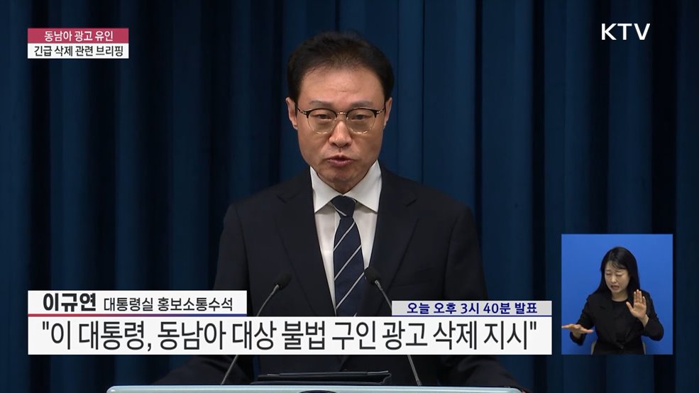 동남아 광고 유인 긴급 삭제 관련 브리핑 이규연 / 대통령실 홍보소통수석 (오늘 오후 3시 40분 발표)(장소: 대통령실 브리핑룸)