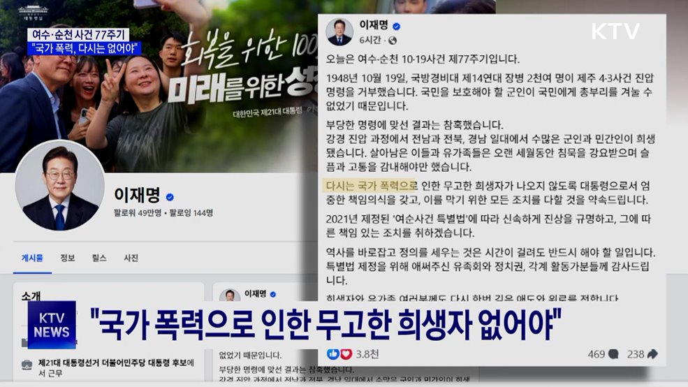 김현지 앵커>이재명 대통령이 여수·순천 10.19사건 77주기를 맞아 국가 폭력으로 인한 무고한 희생자가 나오지 않도록 모든 조치를 다하겠다고 강조했습니다.여순사건 특별법에 따른 진상규명에 속도를 내겠다고도 밝혔습니다.윤현석 기자의 보도입니다.윤현석 기자>1948년 전남 여수에 주둔하고 있던 일부 군인들이 국가의 제주 4.3사건 진압명령을 거부하면서 비롯된...