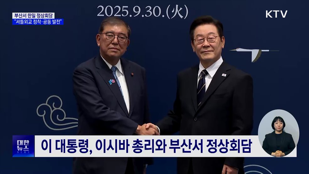 김경호 앵커>이재명 대통령이 부산에서 이시바 시게루 일본 총리와 한일 정상회담을 했습니다.이 대통령은 이번 회담을 '셔틀외교의 진수'라 평가하고, 한일 양국이 시도때도 없이 오가며 공동의 발전을 기약했으면 좋겠다고 말했습니다.이혜진 기자의 보도입니다.이혜진 기자>이재명 대통령과 이시바 시게루 일본 총리가 부산에서 만났습니다.지난 8월 이 대통령의 일본 방문...