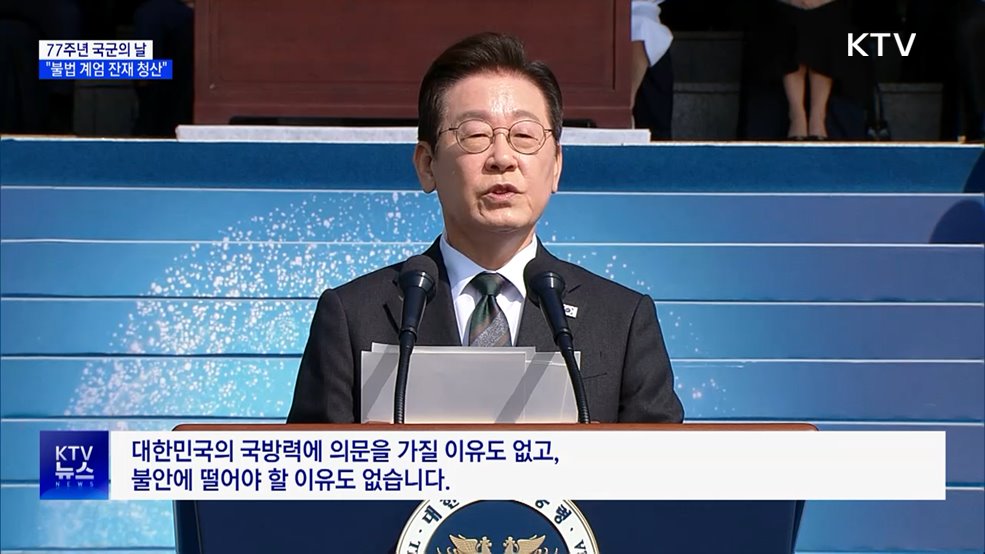 김유영 앵커>취임 후 첫 국군의날 기념식에 참석한 이재명 대통령이 군통수권자로서 불법 계엄 잔재를 청산하겠다고 강조했습니다.또 우리나라가 역사상 그 어느 때보다 강력한 국방력을 갖추고 있다며, 이를 바탕으로 자주국방의 길로 나가야 한다고 밝혔습니다.최영은 기자의 보도입니다.최영은 기자>제77주년 국군의날 기념식(장소: 충남 계룡대)이재명 대통령이 6.25전...