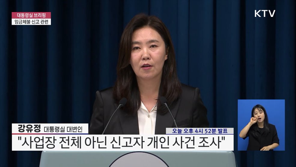 대통령실 브리핑 - 임금체불 신고 관련강유정 / 대통령실 대변인 (오늘 오후 4시 52분 발표)(장소: 대통령실 브리핑룸)