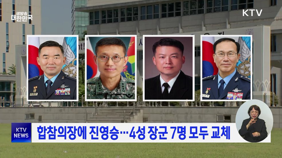 임보라 앵커>이재명 정부가 첫 대장급 인사를 단행했습니다.국방부는 합동참모의장과 각 군 참모총장, 연합사 부사령관 등 총 7명의 대장급 인사를 내정했습니다.합동참모의장에는 진영승 전략사령관, 육군총장에는 김규하 미사일전략사령관, 해군총장에는 강동길 합참 군사지원본부, 공군총장에는 손석락 공군 교육사령관이 각각 임명됩니다.한미연합사 부사령관에는 김성민 5군단...