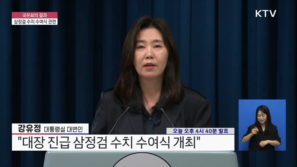 국무회의 결과·삼정검 수치 수여식 관련강유정 / 대통령실 대변인 (오늘 오후 4시 40분 발표)(장소: 대통령실 브리핑룸)
