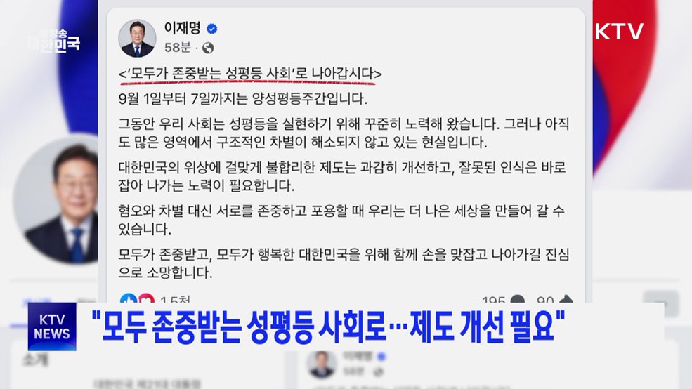 김현지 앵커>이재명 대통령이 양성평등주간을 맞아 모두가 존중받는 성 평등 사회로 나아가자고 제안했습니다.이 대통령은 SNS 메시지를 통해 그동안 우리 사회는 성 평등을 실현하기 위해 꾸준히 노력해왔지만 아직도 많은 영역에서 구조적 차별이 해소되지 않고 있다며 불합리한 제도는 과감히 개선하고 잘못된 인식은 바로잡는 노력이 필요하다고 밝혔습니다.이 대통령은 이...