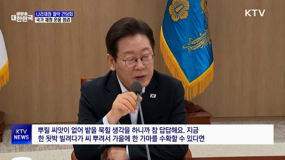 김용민 앵커>이재명 대통령이 국가 재정 운용 상태를 점검했습니다.김현지 앵커>이 대통령은 국가 재정이 취약해 쓸 돈이 없다며 가을 수확을 위해 빌려서라도 씨를 뿌려야 한다며 확장 재정 기조를 시사했는데요.박지선 기자입니다.박지선 기자>나라 재정 절약 간담회 (장소: 13일, 용산 대통령실)이재명 대통령이 나라 재정 절약 간담회를 열고 국가 재정 운용을 점검...