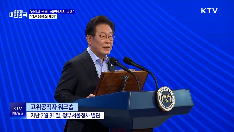 김현지 앵커>이재명 대통령이 각 부처 장차관 등 고위공무원을 대상으로 특강을 진행했습니다.이 대통령은 공직자의 권력은 국민에게서 나온다면서 국민의 뜻을 바라봐야 한다고 강조했습니다.또 공직사회 행정 정상화를 위해 직권남용죄를 개정하겠다고 밝혔습니다.윤현석 기자의 보도입니다.윤현석 기자>고위공직자 워크숍(장소: 31일, 정부서울청사 별관)장차관 등 고위공무원...
