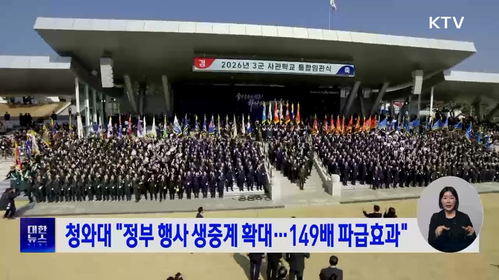 모지안 앵커>청와대는 정부 행사 생중계 확대와 원본 영상 무료 공개로 다양한 추가 콘텐츠가 생산돼 '저비용 고효율'의 파급효과가 나타났다고 밝혔습니다.이규연 청와대 홍보소통수석은 지난달 20일 육해공 3군 사관학교 통합임관식 생중계 사례를 들어, 단 2개의 KTV 원본 영상으로 추가 콘텐츠 297개가 생산돼 149배 파급 효과를 달성했다고 설명했습니다.이 ...